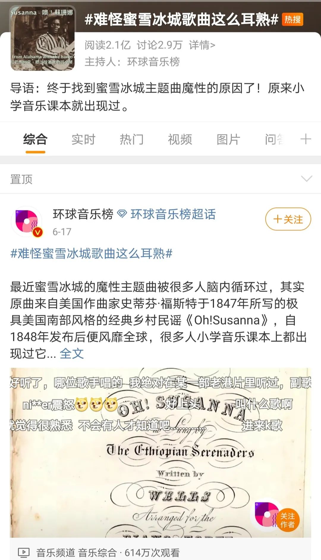 直到6月17日,@环球音乐榜 发布微博,帮助网友找到蜜雪冰城主题曲魔性的原因。歌曲改编自美国民谣《Oh Susanna》,原作本身就是朗朗上口、容易传播的旋律,只是我们对非母语的英文歌词很难有共鸣。