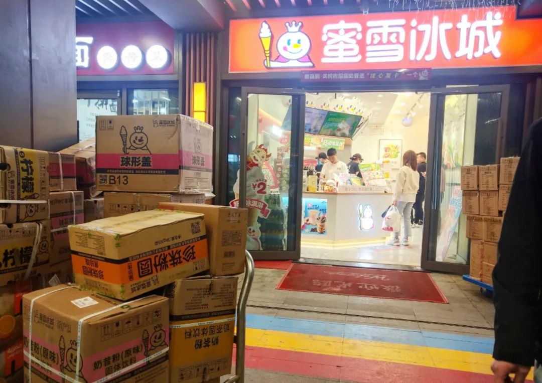 就连刚送到来不及收拾的食材,都直接摆放在店面门口,这种现象被网友调侃为“不拿顾客当外人”。蜜雪冰城凭借也接地气的形象赢得一众网友的好感。