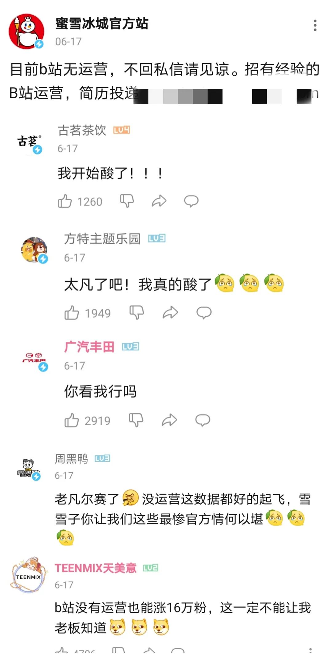 面对网友们的二次创作,蜜雪冰城也积极地给予了回应。在微博上连续转发网友的创作内容,激励了用户的创作欲。而且由于B站没有专门的运营,还在官方动态中直接发布招聘信息,不仅引起粉丝的关注,还引来众多品牌官方“羡慕”调侃。