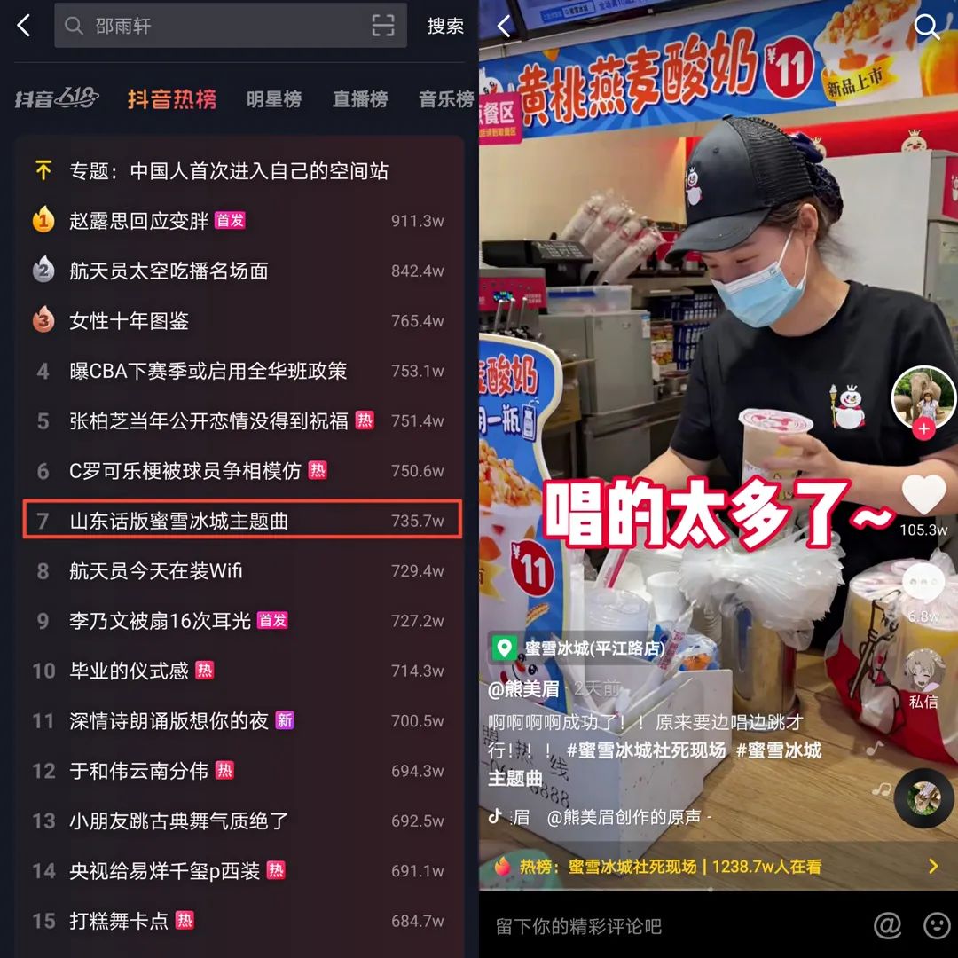 在抖音上,围绕蜜雪冰城主题曲展开的话题也不在少数。不仅#山东话版蜜雪冰城主题曲#登上抖音热榜,@校哈寝室 发布的说唱版蜜雪冰城获得了近200万的点赞。#蜜雪冰城社死现场#也成为大家创作的来源,现在该话题下视频总播放量也超过6.1亿次。