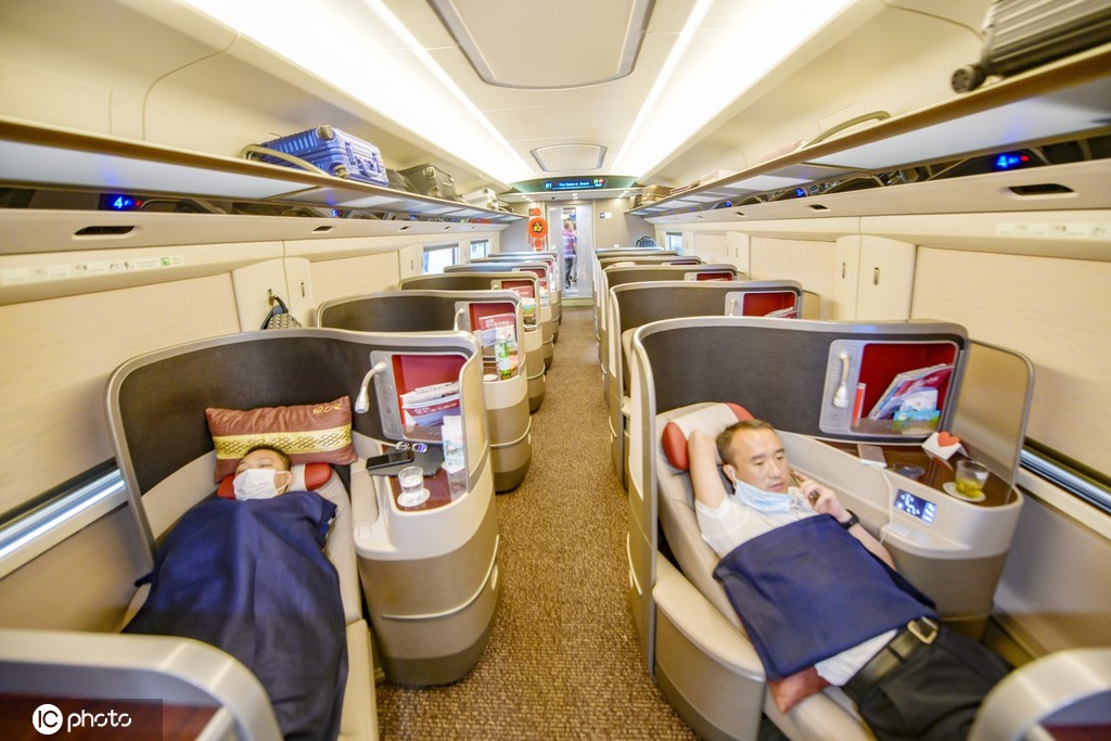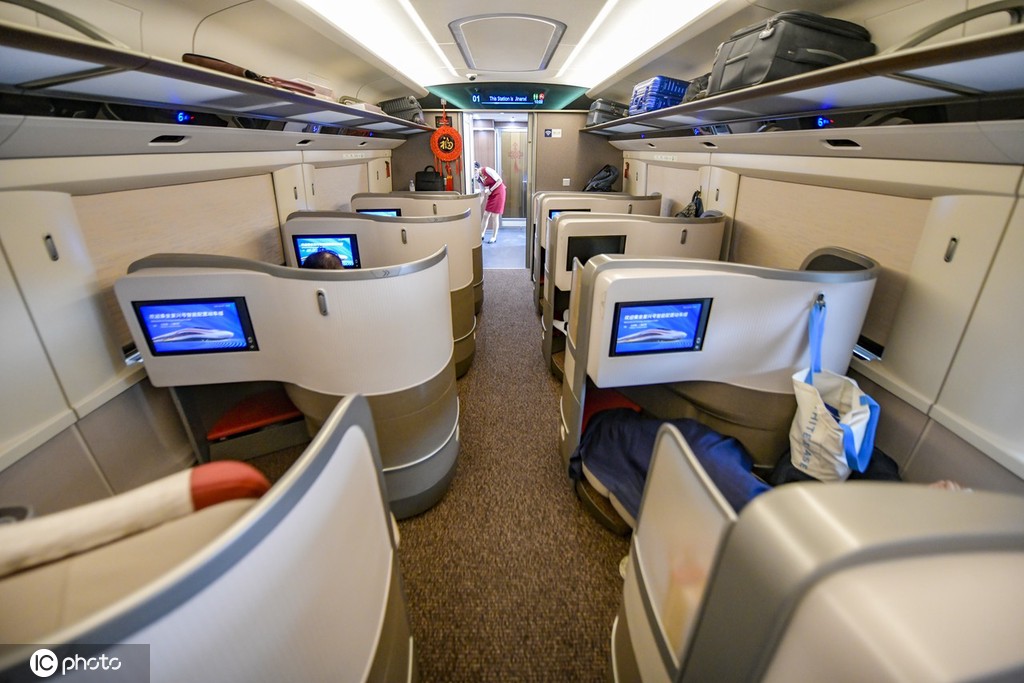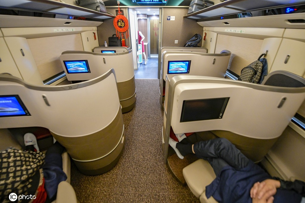 复兴号智能动车组商务座椅采用全新设计,灵感来源于“太极图”,用流畅大S曲线对前后排功能进行分割,一人一舱,并采用1+1鱼骨式布局,提高了私密性、便捷性、舒适性;座椅更宽敞,可实现“坐姿、半躺、平躺”三种姿态一键切换;配备支持无线投屏的智能交互终端,提供丰富的运行信息、影音娱乐等服务;增加无线充电功能。
