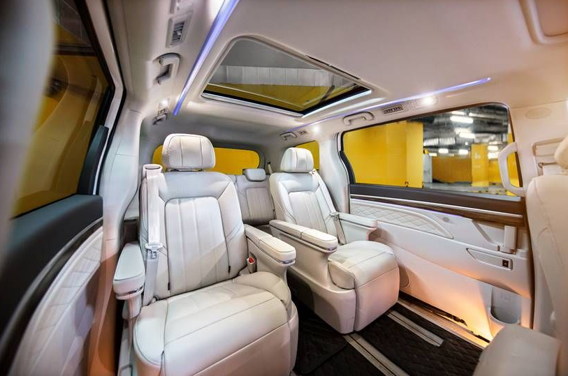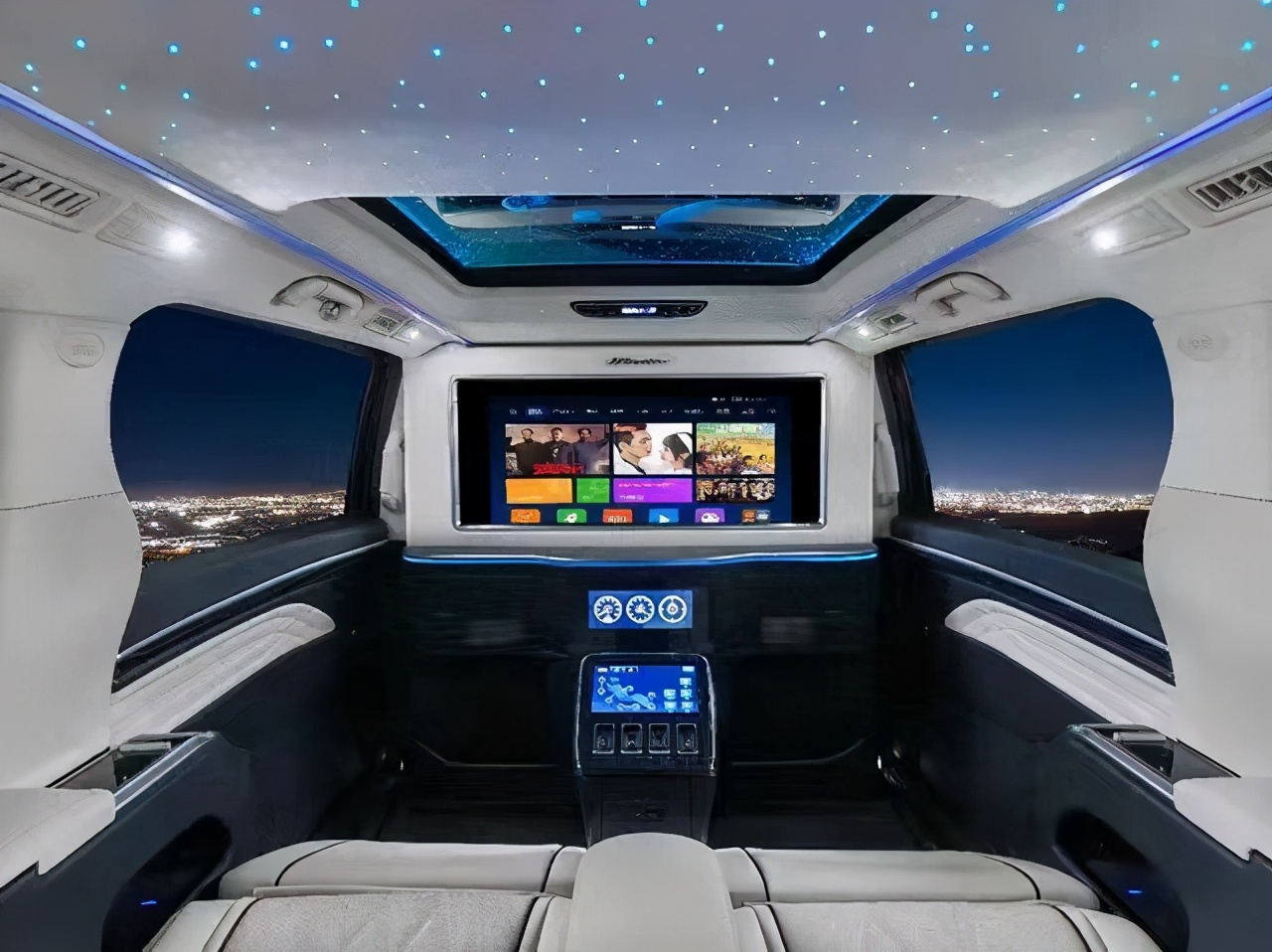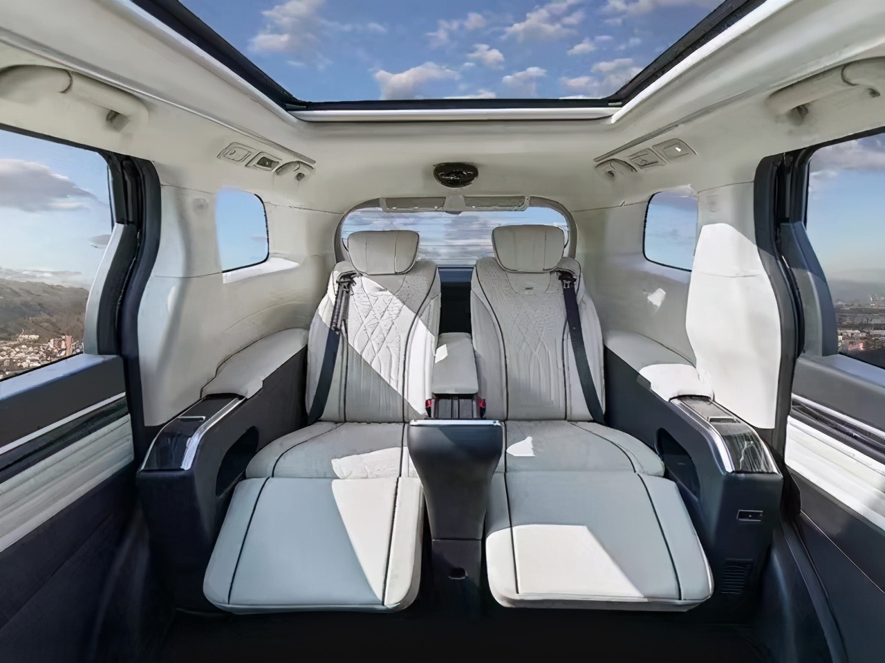 重点还是在于后排,各种电动调节、腿托等功能齐全的航空座椅是必不可少的。座椅对面便是一块高清电视,简直就是车内影院。两侧车窗视野宽阔,加上全景天窗可带来良好的视野及采光效果。欣赏完车外风景,头上的天窗还可以形成星空天幕,加上四周的氛围灯又是别一番科技感风味。