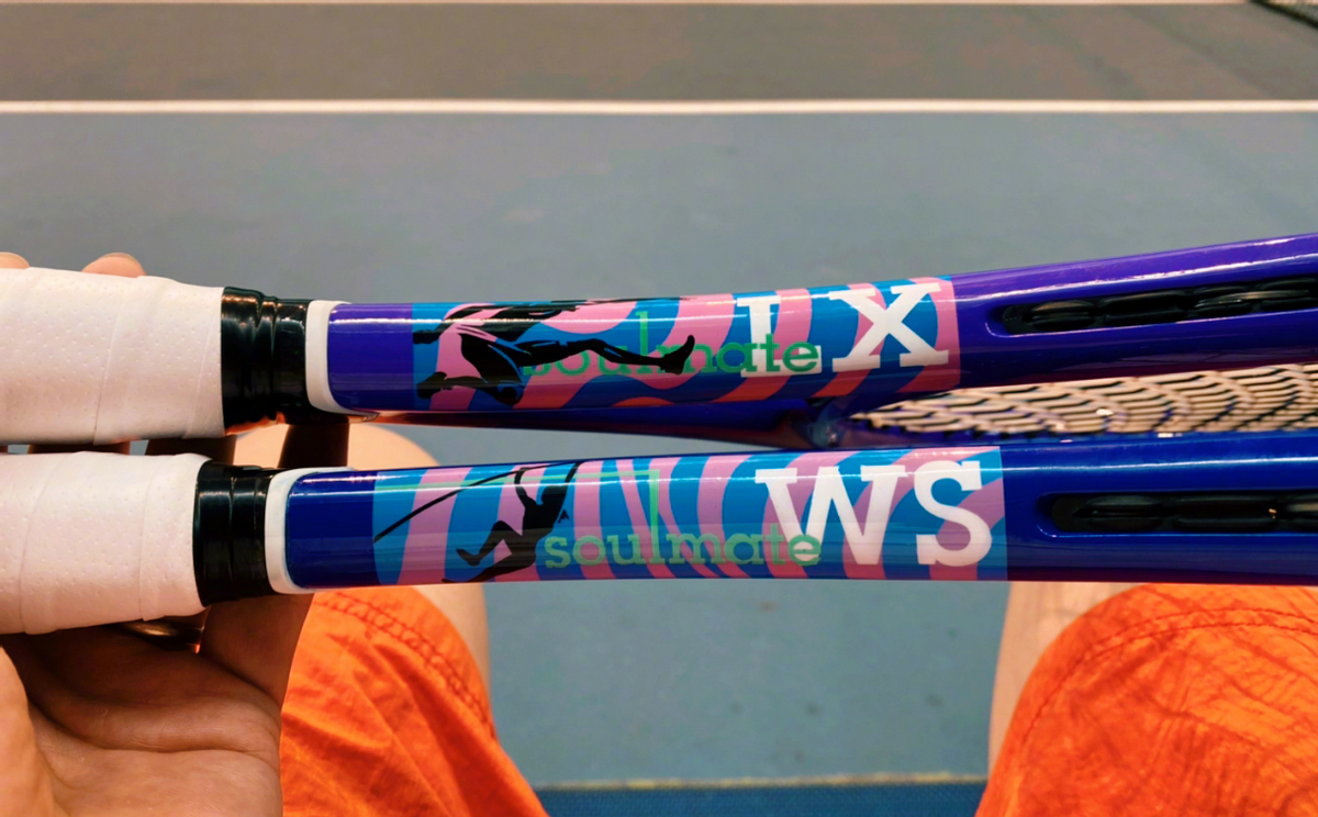 早先,刘翔曾经在社交媒体上晒出过自己与妻子吴莎的定制球拍。在这幅网球拍上,不仅刻着刘翔与吴莎的名字拼音,更是将俩人代表性的跨栏和撑杆跳也融入进去,是妥妥的情侣模板,刘翔自己也说道,这是绝配。