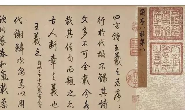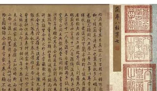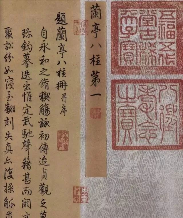 此八柱每柱刻帖一册。按八卦之名“乾、坎、艮、震、巽、离、坤、兑”为序。其中虞、褚、冯摹本和柳书兰亭诗为内府所藏。八帖帖首有乾隆撰写题记,帖后附刻历代名人题跋。前后有“乾隆御览之宝”印章。现藏故宫博物院。
