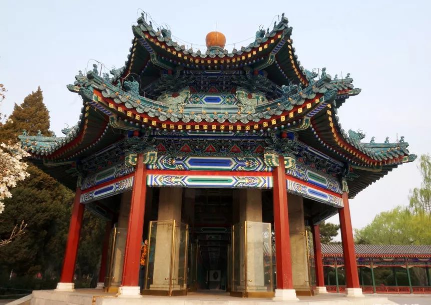 兰亭八柱于1910年被移到颐和园,后置于耶律楚材祠中。1915 年,江朝宗致函溥仪内务府,请求拉运圆明园兰亭碑及山石,以供社稷坛开拓公园之用。其后,兰亭碑及八根石柱,分别于1917年前和1941年之后运至中山公园,直到1971年,始用八根石柱,在唐花坞西侧新建成重檐八角亭,额曰"景自天成"。八根石柱之兰亭帖,多有风化,半数帖尚好,仍可辨读。