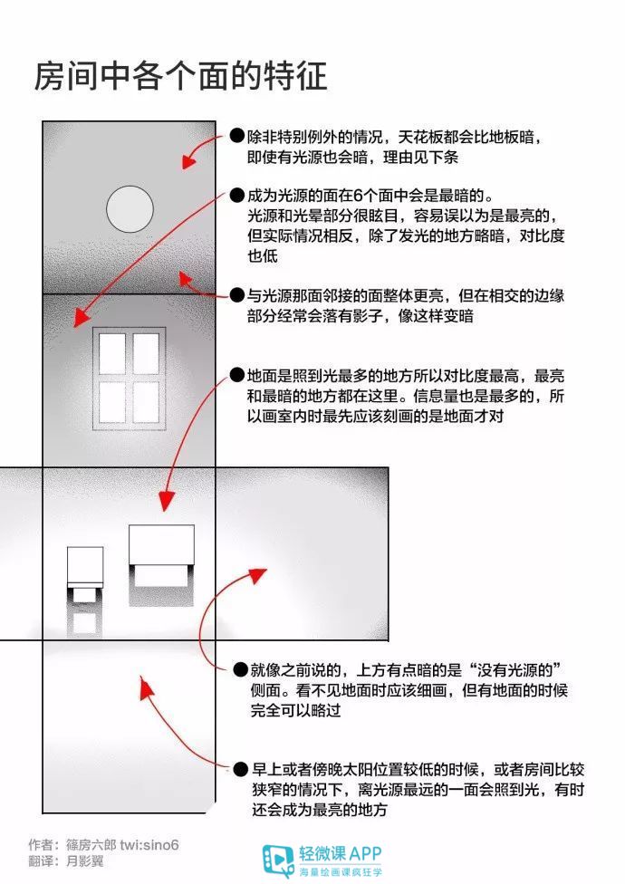 · 地面是照到光最多的地方所以对比度最高,最亮和最暗的地方都在这里。信息量也是最多的,所以画室内时最先应该刻画的是地面才对。