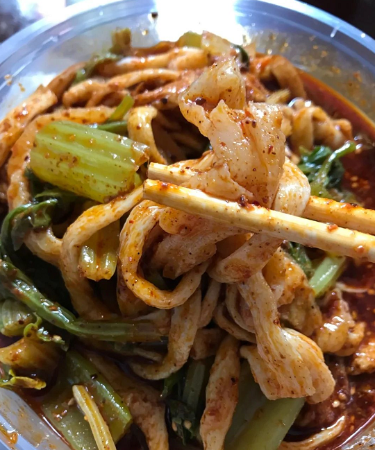 吃的时候可以要“对半儿”即一半面皮一半牛筋面。她家的辣椒油也很特别:拌辣椒的时候挑一根放在辣椒油里再飞快的挑到拌面皮的大盆里搅拌,整个过程一气呵成、行云流水、非常的娴熟。更为特别的是一年四季都有,冬天可温吃,夏天凉吃,外地上学或上班的老乡,每次回来都必到“半截楼”吃碗凉皮才解馋!