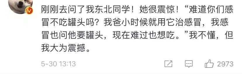 前段时间,网友在微博热议#东北人生病了要吃黄桃罐头#,引发了很多东北人的强烈认同。东北网友在微博下面回复:没错,就是这么回事儿。