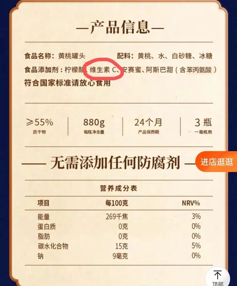 橙色软件上某东北知名品牌黄桃罐头成分表