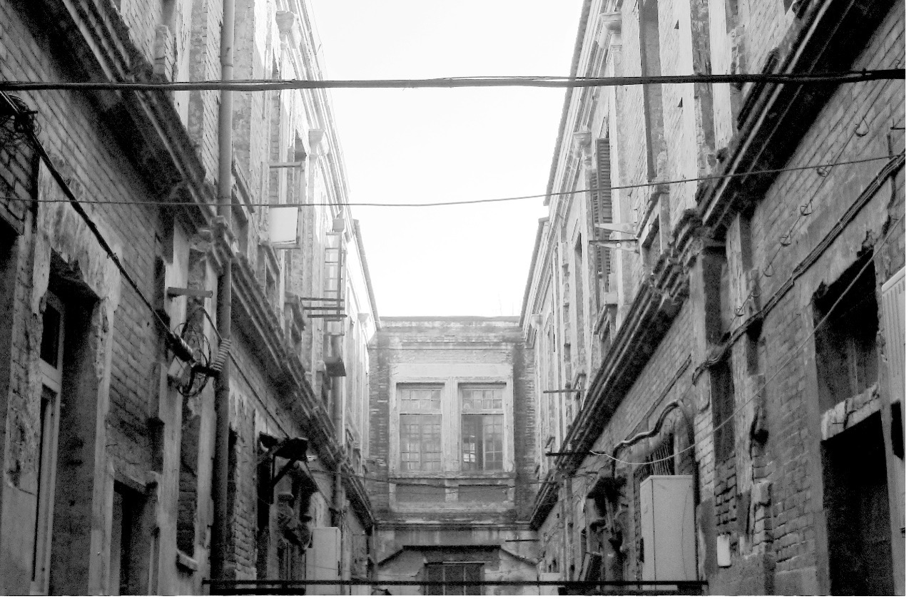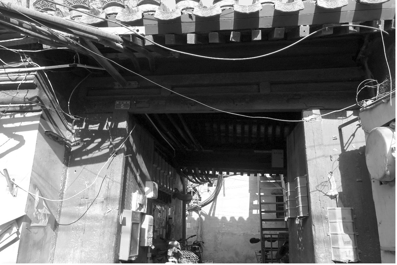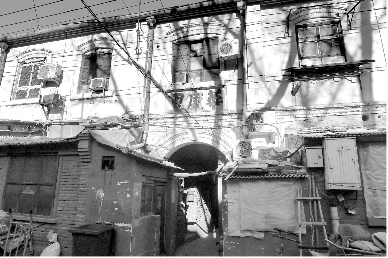 华康里。从1930年开始,这里就叫华康里。华康里建于1915年至1918年间,是当时“新市区”建设中一组封闭的街坊。临街有楼,朝南。在当时确为格局形式新颖之建筑。彼时此处曾有妓院。现在只是一个南北向巷子,窄。巷两边其实就是老房子,但私搭乱建后已不清晰。华康里南边尽头,是一幢楼房的拱形过道。上有标识,西城区普查登记文物。这幢二层青砖楼,简约西式风格,门洞上方写有“华康里”三个大字。看质地,应是民国原版。一层被各种违建包围。