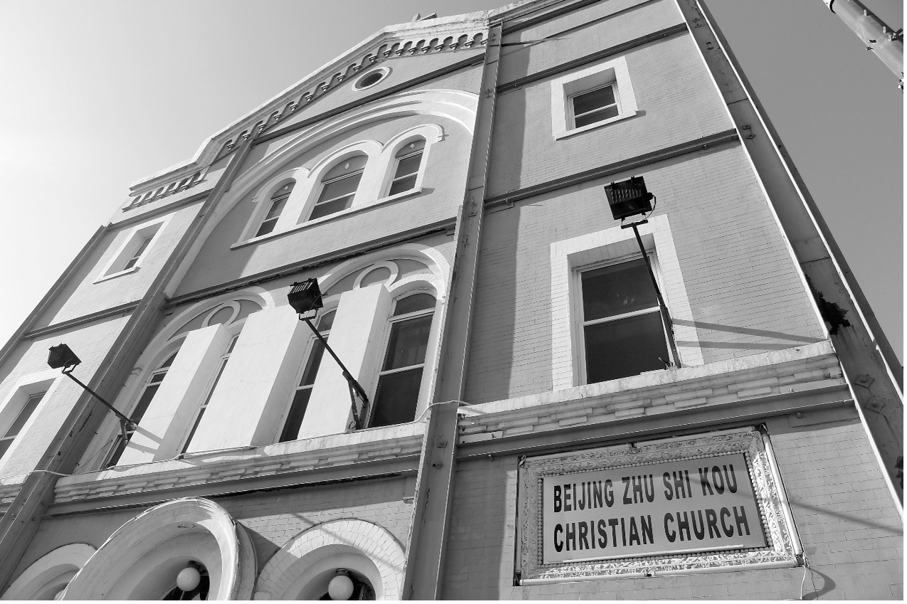 校尉营胡同往东走到头,是一堵围墙。从围墙边往北,竟是一个教堂的背影。此乃珠市口教堂。珠市口教堂是北京南城唯一一座具有简易哥特式风格外貌的基督教堂。正位于珠市口西大街和前门大街两条繁华路段接合处。教堂始建于1904年,是1900年以后美国卫理公会开设的八座教堂的第一座。1921年该堂进行了扩建,基本形成了今日教堂的三层建筑格局。为了保留这处教堂,当年扩建马路时,特意从此绕了一个弯儿。现在,教堂周围周筑都没有了,只有它在路边,显得突兀。