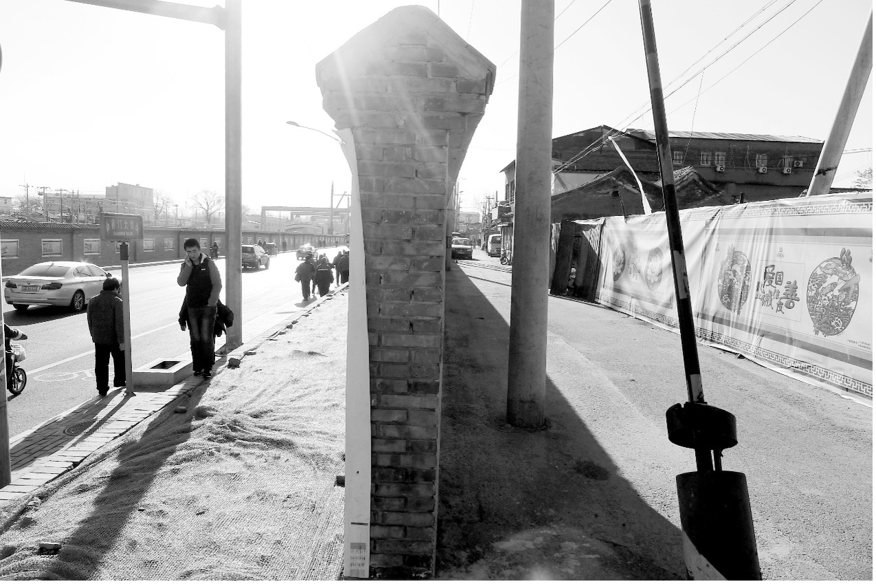 墙隔开新大街和老胡同:左为前门大街,右为铺陈市胡同。