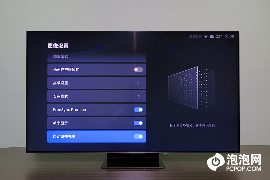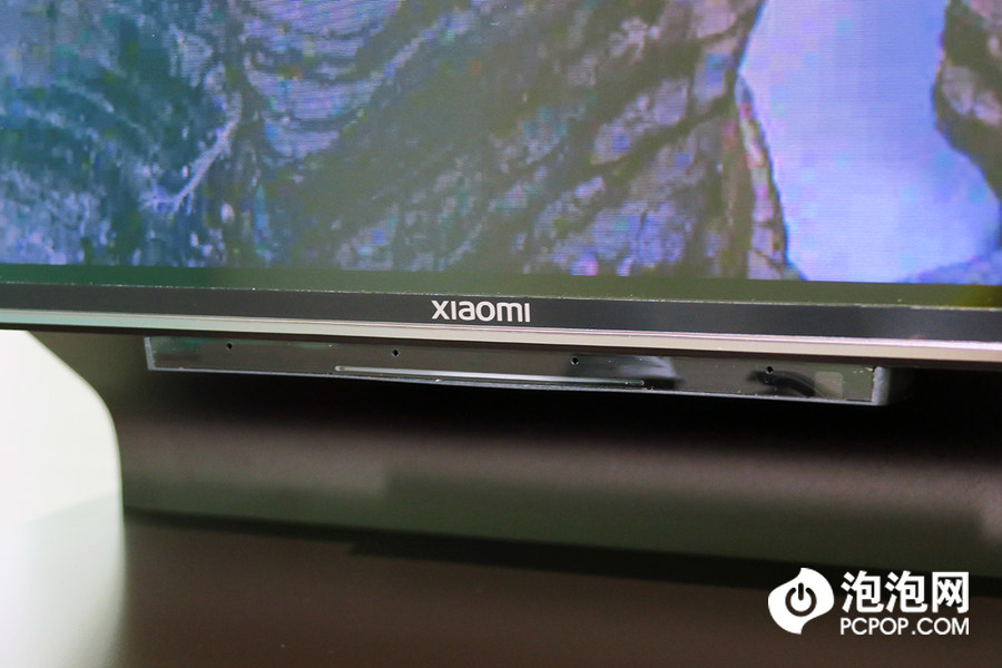 小米电视6至尊版的底部边框上也印有小米全新的LOGO,下方为遥控接收装置,这个地方还有环境光感应器,在设置中开启自动亮度,可以根据环境光自动调节机身亮度。