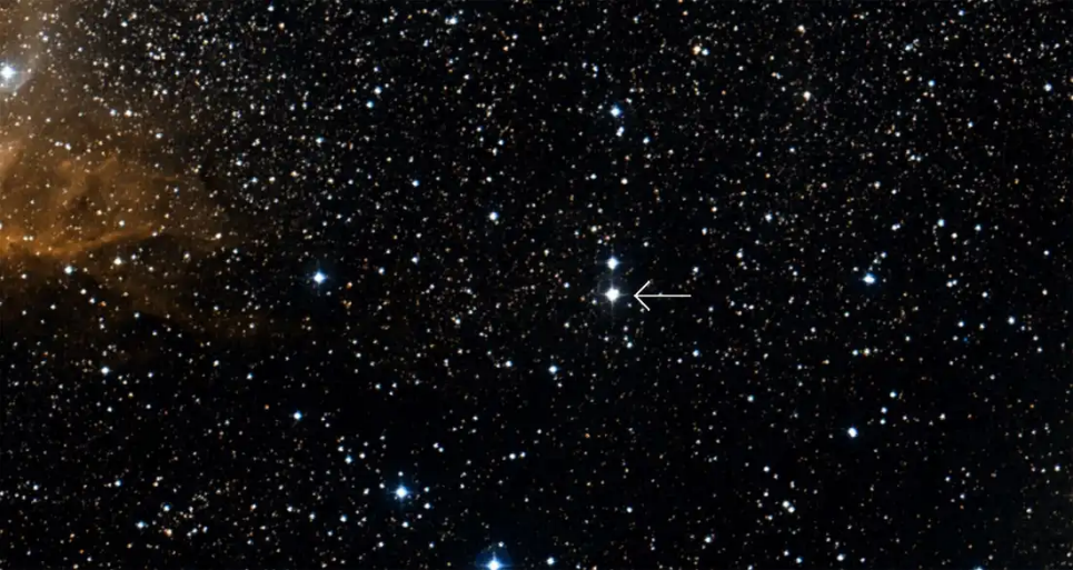 HD 226868星 (箭头所指) 的图像,这是一颗巨大而发光的恒星,它被一个黑洞 (此处未见) 环绕,形成天鹅座X-1。