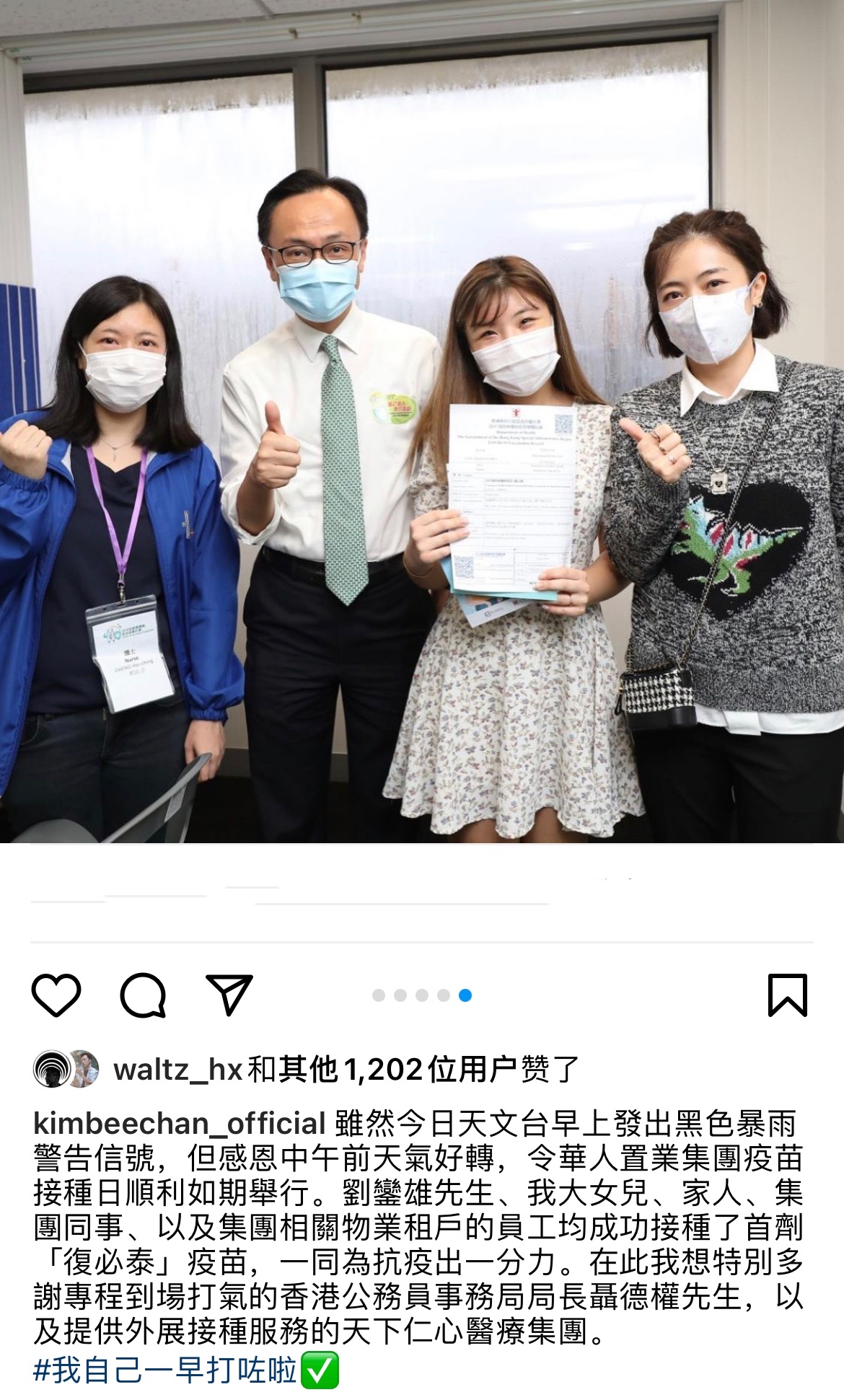 时隔一年多能够看到大刘露脸,是因为施打疫苗的关系,这个还真是颇为令人意外,没想到大刘会带头施打疫苗。甘比主导下的华置,继续秉承大刘热心社会事务、公益的作风,为了呼吁市民打疫苗也是用心良苦,又送楼,又送股票的,还在皇室堡设立了疫苗接种中心,优先安排员工、租户施打。而为了起到施打的表率作用,甘比还带着大刘、以及12岁的女儿刘秀桦一起施打,向外证明的是年长、体弱的人士只要在医生的评估之下可以施打,而未成年的人士也可以施打,值得一提的是大刘施打的是复必泰。