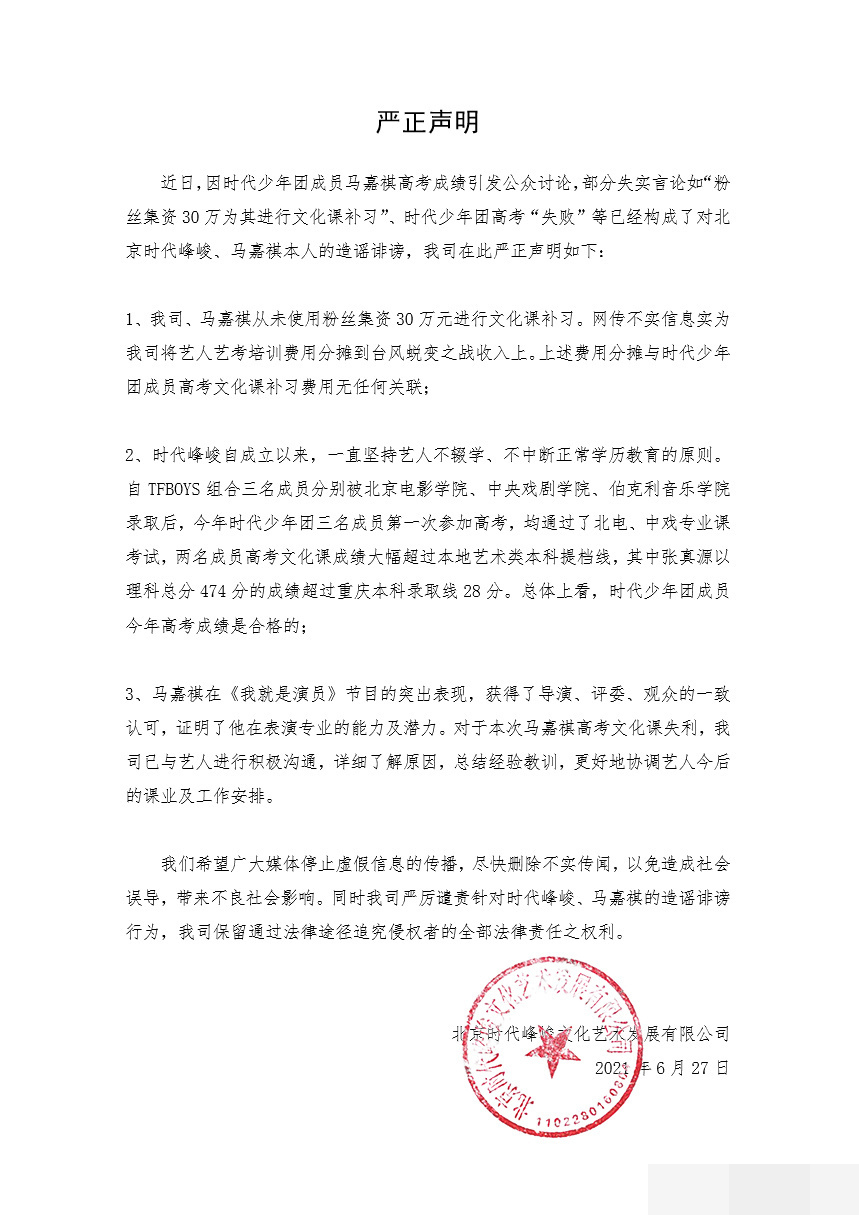 因为一个高考,最近时代峰峻真的很忙,一般而言,明星高考不都是他自己的事吗?但是在时代峰峻这里,就不是一个人的事了,因为马嘉祺高考翻车的情况,导致马嘉祺被群嘲,时代峰峻迫于压力还不得不发布声明,来回应这次马嘉祺的高考失利。