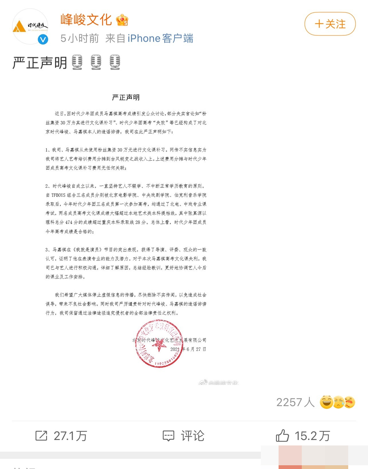 时代峰峻发布了声明,其实你会发现挺有意思的,回应里说了很多有的没的,看似回应了又好像什么都没回应,甚至还提到了TFBOYS来给时代峰峻挽尊,意思就是旗下艺人成绩还不错,不能说大家都不爱学习。