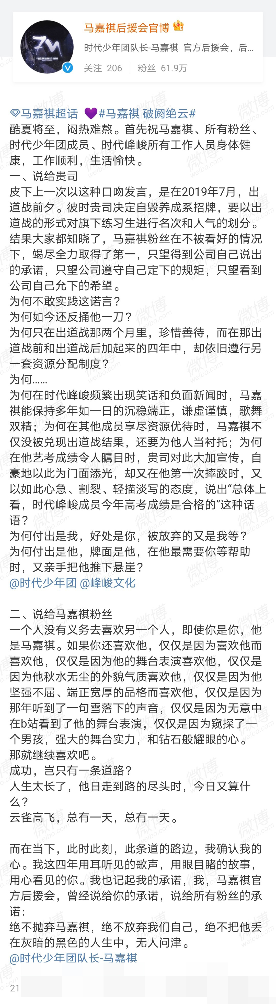 这个时候粉丝当然不干啊,觉得时代峰峻没有处理好马嘉祺高考失利的事情,然后就开始公开喊话了,马嘉祺后援会以官方的身份发布了长文,对话时代峰峻,要求时代峰峻给个说法。以前其实粉丝后援会经常会做这种事情,但马嘉祺后援会这次的对话明显不一样。