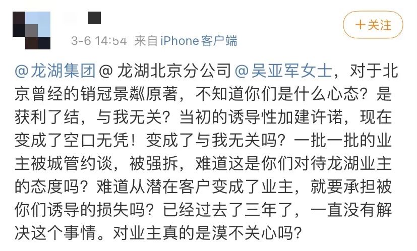 有业主发微博向龙湖集团董事会主席吴亚军控诉,“当初的诱导性加建许诺,现在变成了空口无凭!变成了与我无关吗?一批一批的业主被城管约谈,被强拆,难道这是你们对待龙湖业主的态度吗?”