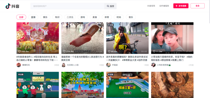 右上角则是抖音官网、创作者服务、发布视频按钮和登录键,创作者服务方便抖音的创作者进入服务平台,进行各种操作,查看实时热点、热门视频等等。