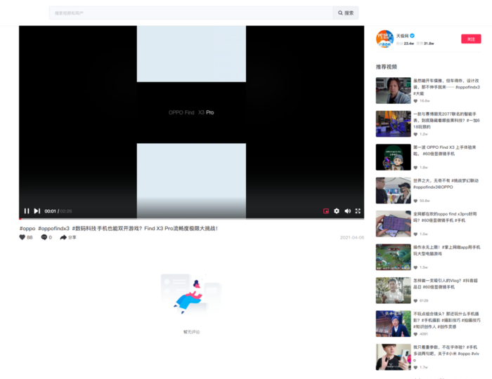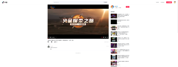 值得一提的是抖音网页版推送给你的视频大多为横版,而不是在手机上的竖版视频;当然如果主动搜索还是能够搜到的,不过抖音并没有为网页版进行单独的竖屏优化,竖版视频在播放器中依然会有两侧的黑边,期待后续的改进。