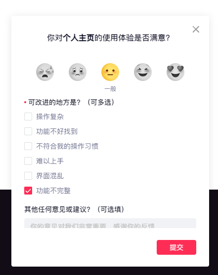 抖音还是十分注重收集用户反馈的,尤其是在产品上线的初期,有这种态度做好产品指日可待。虽然网页版有小窗模式,但是仅限于在网页内,因为浏览器最小化后视频并不会悬停在桌面上,同时这个小窗也不能调整尺寸,似乎……对摸鱼并没有什么帮助(不是)。