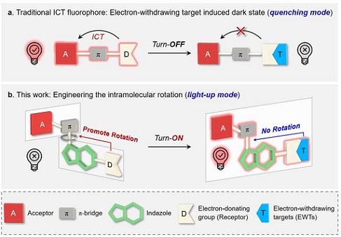 该研究团队发展了一种简单的、普适性的“荧光反转”分子设计策略,如将吲唑等分子砌块插入ICT荧光团,通过调节分子内旋转驱动能(ΔERDE),成功解决了强吸电子诱导ICT染料荧光猝灭这一挑战难题。具体来说,通过逆转分子内旋转驱动能量ΔERDE,从而使传统ICT染料的猝灭模式转变为点亮模式。
