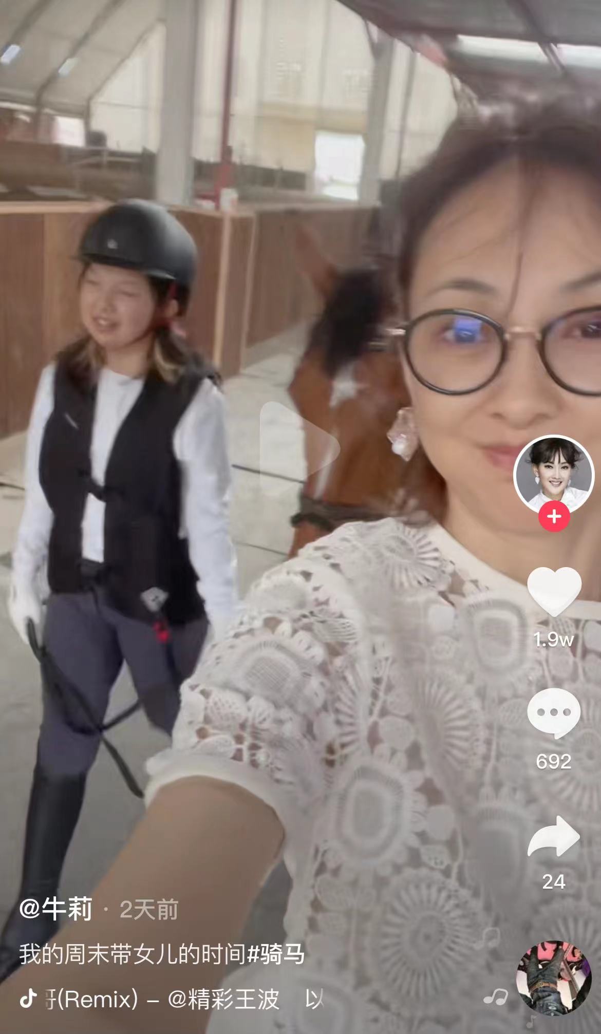 从牛莉晒出的视频中,我们可以看到当天牛莉身穿一件白色镂空上衣,戴着黑框眼镜,打扮十分休闲,而她的女儿则是穿着一身骑士服,手上牵着绳子,看上去颇有几分专业的味道。