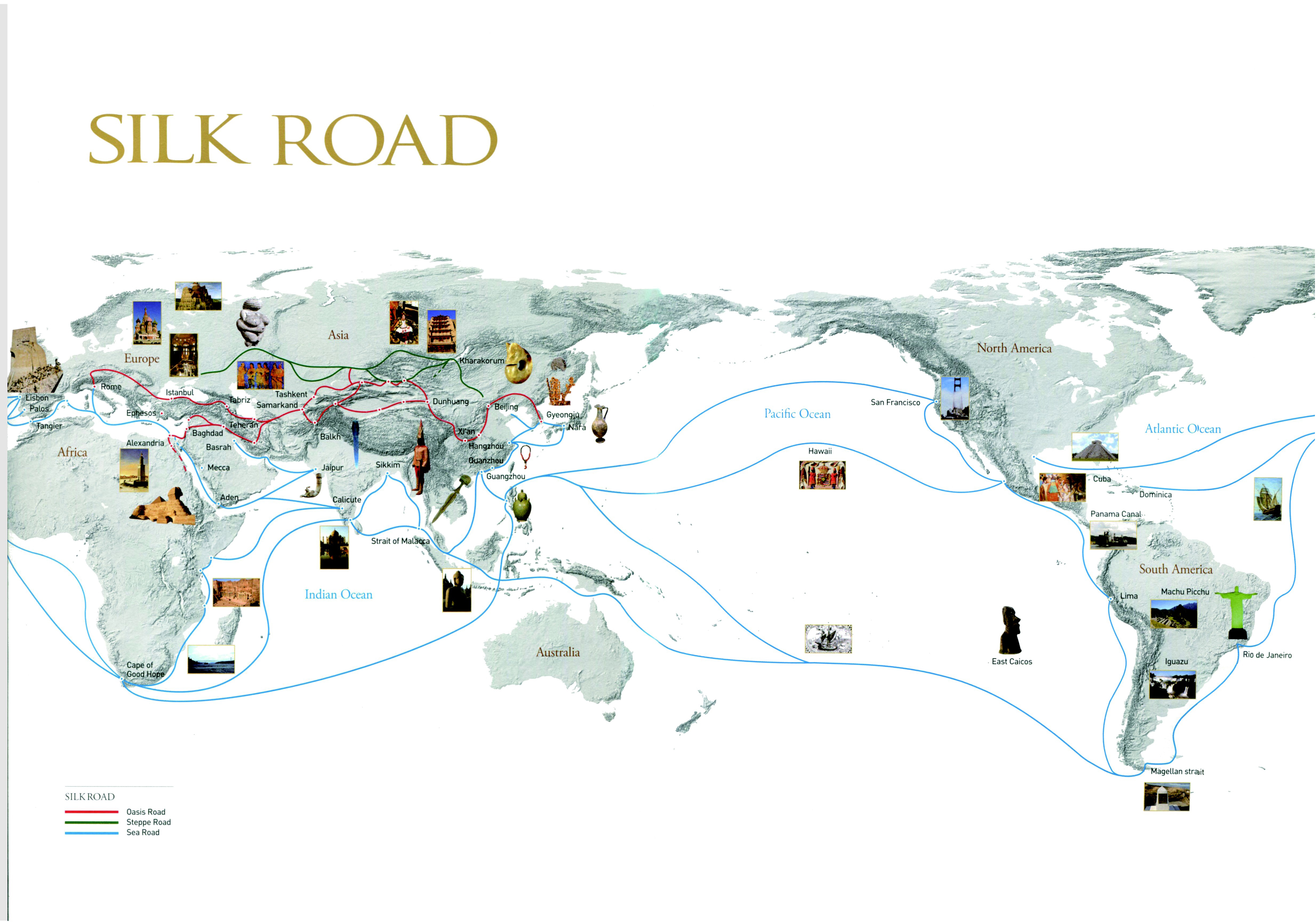 这条古老的陆上交通干道在漫长的形成、发展过程中,曾经是联结中国、印度、希腊、埃及、巴比伦等世界文明古国的纽带。随着历史的演变以及各地政治、军事、经济形势的变化,丝绸之路的线路也呈多样化,往往有多条线路并行,时而沉寂,时而兴旺。但有几条主要干道,总是连接着一些丝路重镇,因而又相对稳定。中国学者在叙述这条要道的时候,通常把丝绸之路分为东段、中段和西段三个大段。