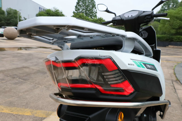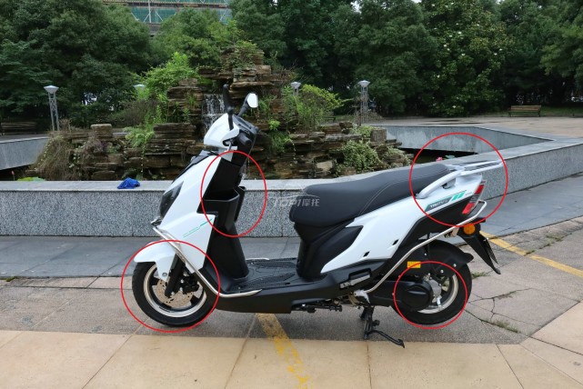 从外观上依稀可以看到一些配置,比如:正立式前叉,前单碟刹,后鼓刹,原厂配备了较大面积的铝合金后扶手和货架,方便加装尾箱,原厂还配备了前后保险杠,左右两侧的储物格看起来空间还不错,手把下方的中间部分也有储物挂钩,据说座桶里面可以放下一顶四分之三盔。