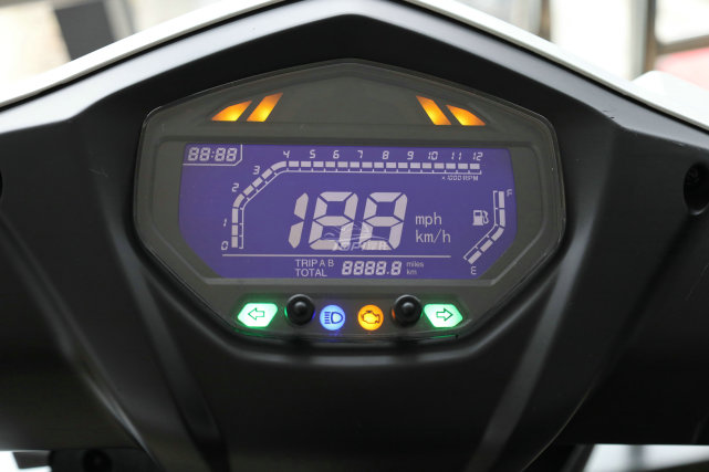 全液晶的单色仪表盘面积不算小,蓝底白字的配色白天和晚上都有很不错的辨识度,内部显示一些基本的信息也比较简单,在125级别当中这块仪表还是颇有档次感的。