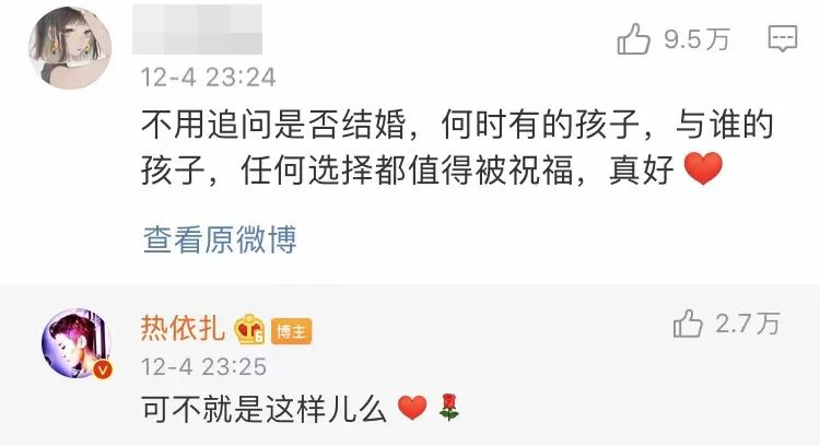 这条微博下面,热评第一是这样的说的:“不用追问是否结婚,何时有的孩子,与谁的孩子,任何选择都值得被祝福,真好。”