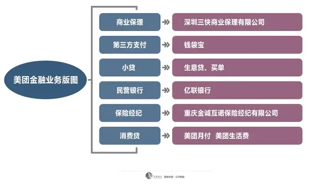 有了支付业务作为基石,美团金融先后成立了商业保理公司、小额贷款公司和保险经纪公司,此外,美团又通过旗下三快科技入股吉林亿联银行,曲线拿下民营银行牌照,逐一布局互联网金融中的重磅领域。