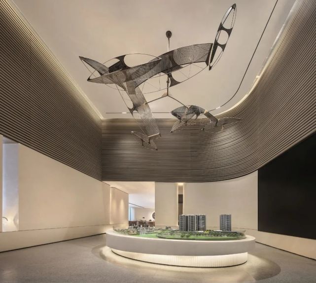 抬头仰望,沙盘上方的艺术造型令人联想到广袤无垠的星空廊桥,传递高远、浩瀚、璀璨的气质,这是场地与城市,建筑与自然,现在与未来之间的联系纽带,艺术营造的意韵在自然与现代中流转。