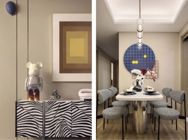 南京融信青澜的样板房,汲取荷兰著名画家蒙德里安的艺术精髓,摒弃了复杂的立体表达,以现代简洁的几何线条与充盈的色彩搭配,赋予空间更多的功能性的和艺术价值。 在温馨的客餐厅中,清爽的色彩搭配简约的装饰,令空间自然流露出一种雅致的韵味,而晕黄的灯光朦胧缱绻,为空间笼上一层温情舒心的暖调。缱绻时光,一家人围坐一处欢声笑语,趣话家常,把生活过成自己想要的模样。