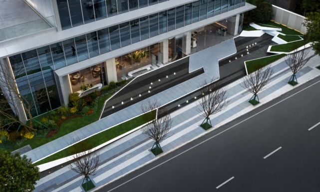 行走其中,澄澈纯净的水面倒映出建筑,层层递进,入眼如同画卷,穿过高低错落的花池,踏过曲折的石板步道,一片水景映入眼帘。此时,观者的心灵灵光乍现,于四季轮转间,豁然开朗,舒心畅然。