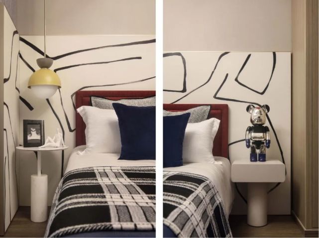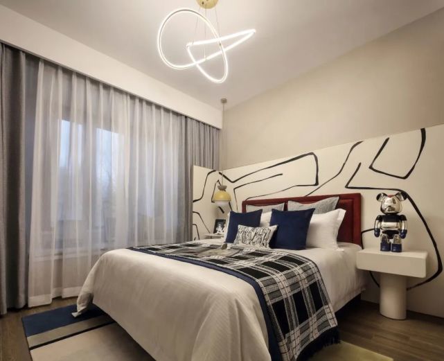 淡雅主卧,以利落的现代质感呈现,简约的几何形体床架搭配床品,通过局部的色彩装饰营造出简约而不简单的淡雅意境,不同于大面积色彩的明艳观感,于细节之处彰显出典雅的现代美学。