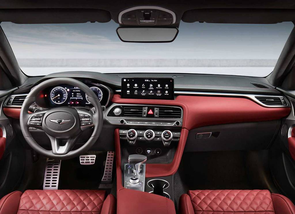 座舱内部,捷尼赛思G70猎装版基本算是照搬G70设计,向驾驶员一侧倾斜的中控台不仅在操作上更便捷实用,视觉效果上更实现了战斗与时尚感兼具的设计美感。