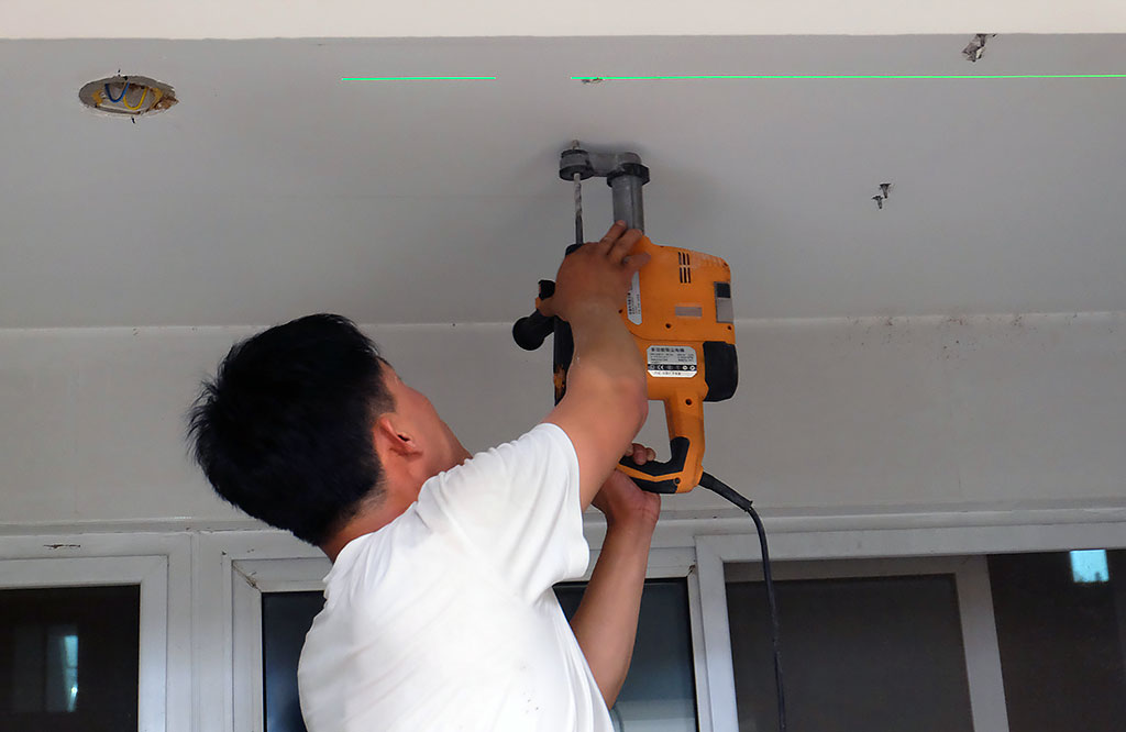 厂家为安装师傅提供了一张定位隔板,有了它就可以准确地定位4颗膨胀螺丝的安装位置,配合激光导向仪,师傅很快就在屋顶上定好位,打眼、安装膨胀螺丝、固定晾衣机,一气呵成。