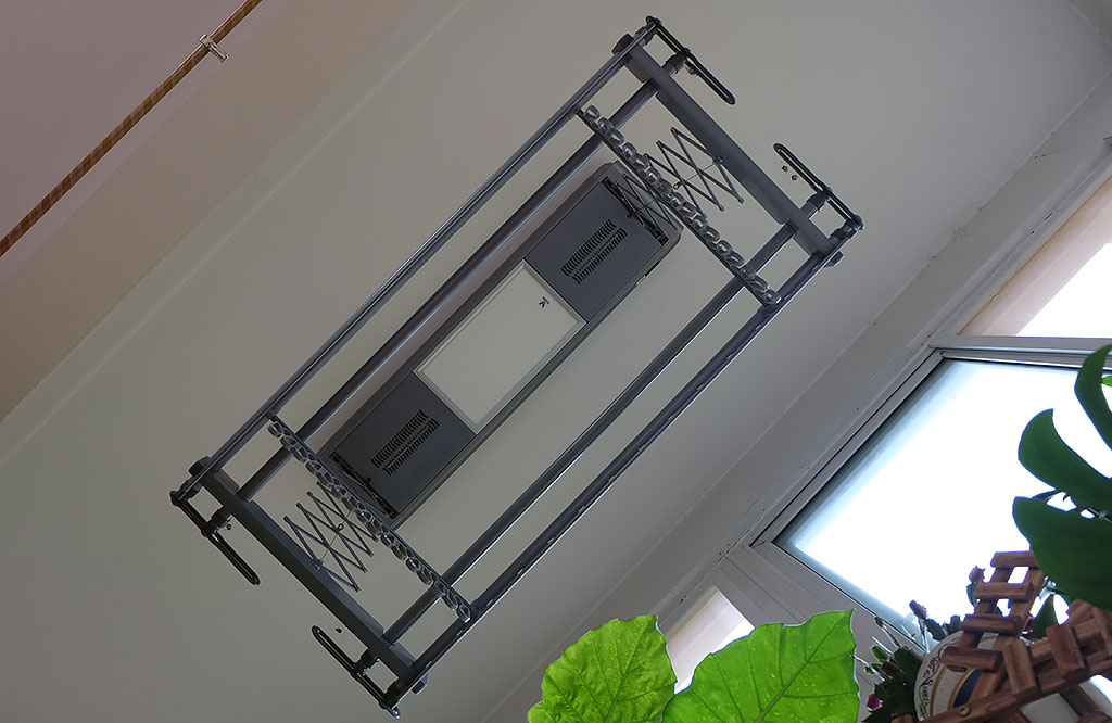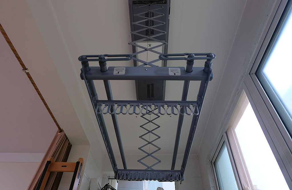 上图为笔者家的手动晾衣架:2根晾衣杆、1套细钢丝绳、1个手摇器,使用到现在差不多有7、8年了,细钢丝绳也开始了断裂,手摇器也开始不听使唤,晾晒的衣物一重,手摇器便卡不住,导致晾衣架直线下滑到最低处,严重影响晾衣效果。