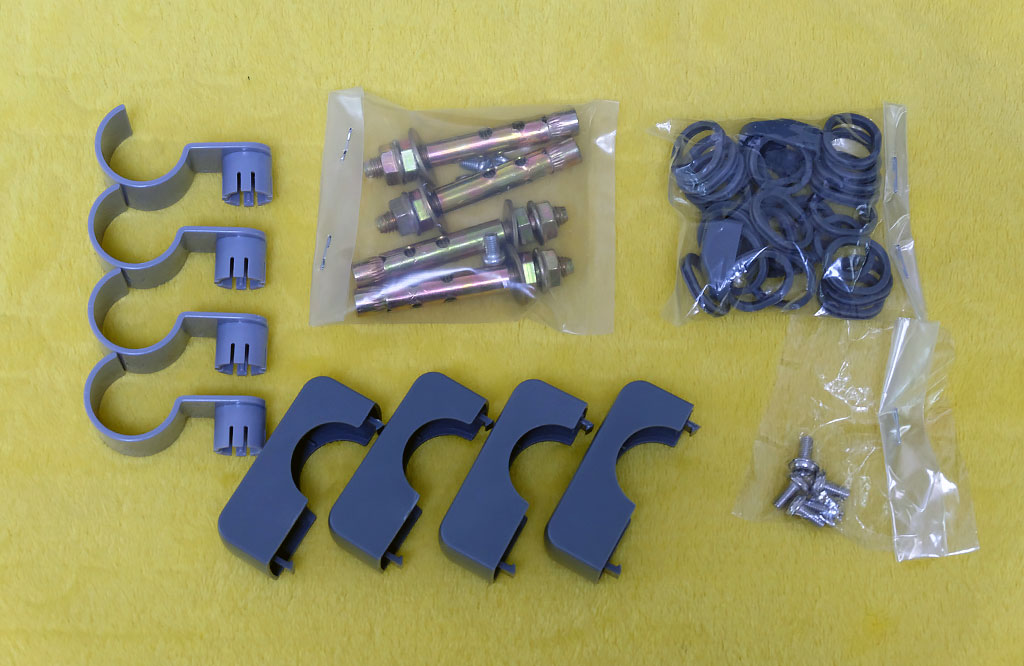 云米互联网晾衣机智能烘干版随机的附件:母婴夹挂钩、晾衣杆堵口、固定晾衣机用的膨胀螺丝、固定晾衣杆螺丝,以及晾衣杆孔位橡胶圈等。