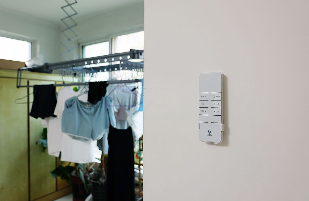 另外云米为用户提供了晾衣机的专用遥控器,同时支持壁挂,这项壁挂设计非常好,相比电视遥控器、空调遥控器,更加不容易丢失,升降、停止、照明、吹风、烘干,只需一键操作,即可实现,非常方便。