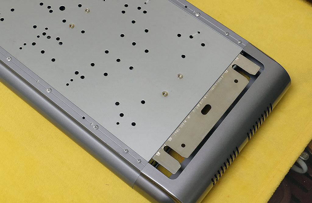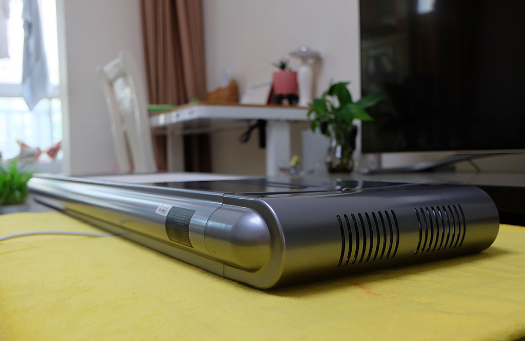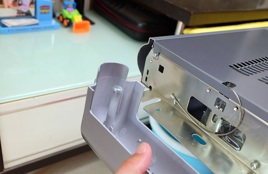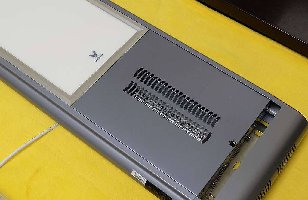 上图为云米这款晾衣机的背板一侧,上设密集不规则的散热孔,按照空气散热地对流原理,方便散发晾衣机内部热量,同时晾衣机两侧分别设有固定钢板,用来承架晾衣机。
