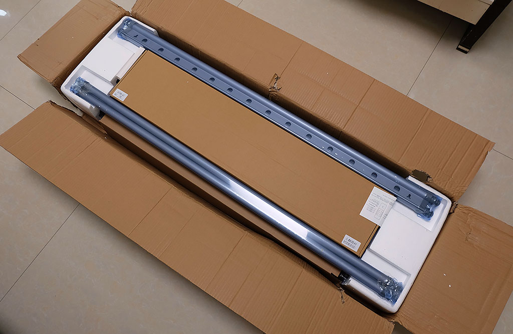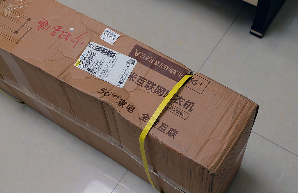 云米互联网晾衣机的包装箱采用较厚的瓦楞纸设计,外束三根黄色束紧打包带,既方便提携,又保护箱体。打开包装箱后,晾衣机的各个附件分层摆放:上层为可伸缩晾衣杆和晾被杆,中间为云米晾衣机主机,下层为晾衣机配套的各个附件。云米主机、晾衣杆、晾被杆、伸缩杆等几个大件都外罩保护膜或塑封,保护相关附件,防尘、防潮、防划。