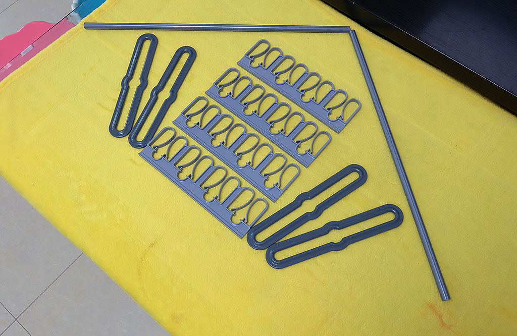 上图类似皇冠的附件为母婴夹,另外还提供了晾衣杆和晾被杆之间的连接挂环,另外2根长条铝合金圆杆为母婴夹导轨,配合专用的塑料挂钩,将母婴夹固定在晾衣杆上。