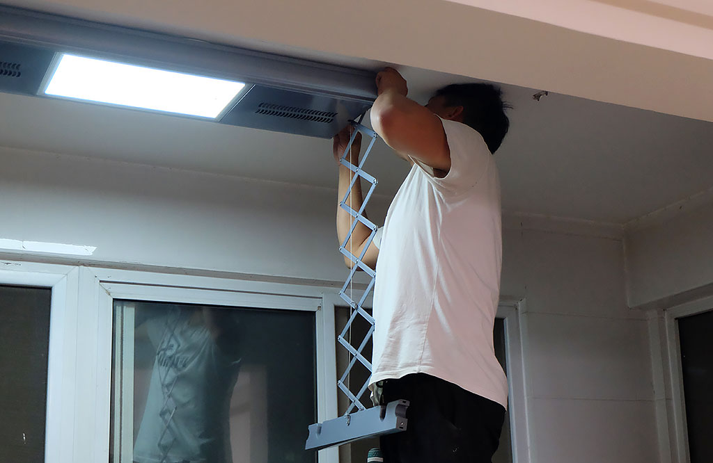 哎呀,到夏天了,安装师傅也特别忙,我的晾衣机安装都排到了晚上,师傅安装还是挺有经验的。因为需要安装的是方形的晾衣机,所以需要做到正南正北,这就特别考验安装师傅的安装功底。