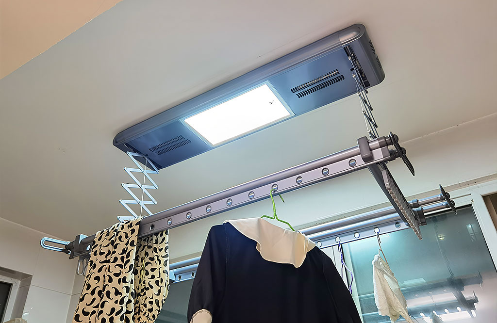 看到晾衣机照明灯两侧的吹风口了吗?这是云米晾衣机的风干和烘干的出风口,它支持风干和烘干两种干衣方式,冬天、阴雨天、闷热天等天气情况下比较适用,尤其是南方现在正处于雨季,衣物难以在短时间内晾干,使用其风干或烘干功能,可以快速吹干衣物。笔者亲自体验了一番晾衣机的烘干功能,站在晾衣机下,能够明显感觉到热风向头顶徐徐吹来,就好像淋浴间的浴霸,使晾衣机周围的空气温度瞬间上升,刚洗的衣物在高温的烘干下,水分得以快速地蒸发,达到速干衣物的效果。