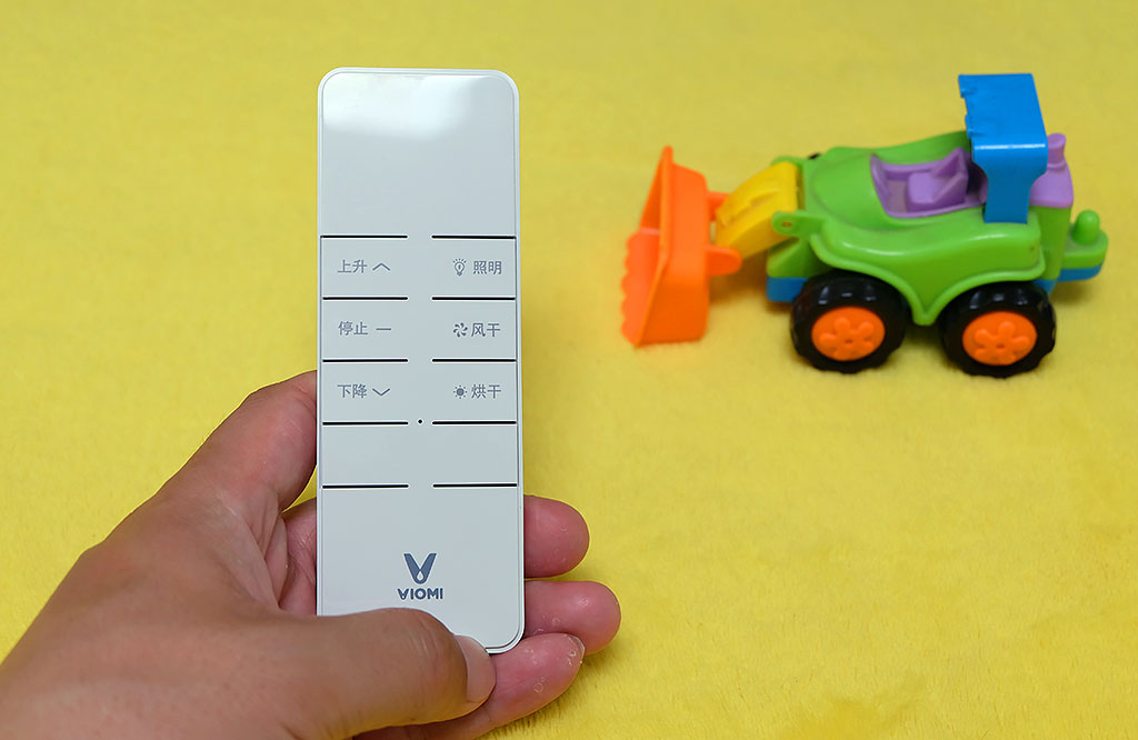 云米的这款晾衣机不仅支持专用遥控器控制,同时还支持米家APP、云米商城APP控制,操控方面非常灵敏。遥控器上设计了上升、停止、下降、照明、风干、烘干等几大功能,遥控器中间部位设有遥控指示灯,通过指示灯状态就可以判断遥控情况或剩余电量。