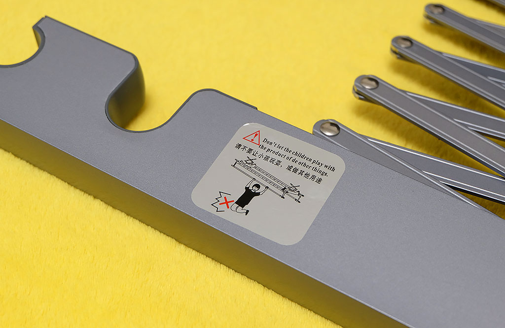 晾衣机的剪刀架跟晾衣杆、晾被杆一样,采用轻量级的航空级铝材,保持轻量的同时,又提高了强度。同时剪刀架拖杆外侧部位贴有安全小贴士:1、不要让小孩玩耍或做其他用途;2、晾衣机运行过程中,请不要站在衣杆下面;3、衣杆升降过程中,请不要把手放在剪刀片之间;4、负重请不要超过35KG。