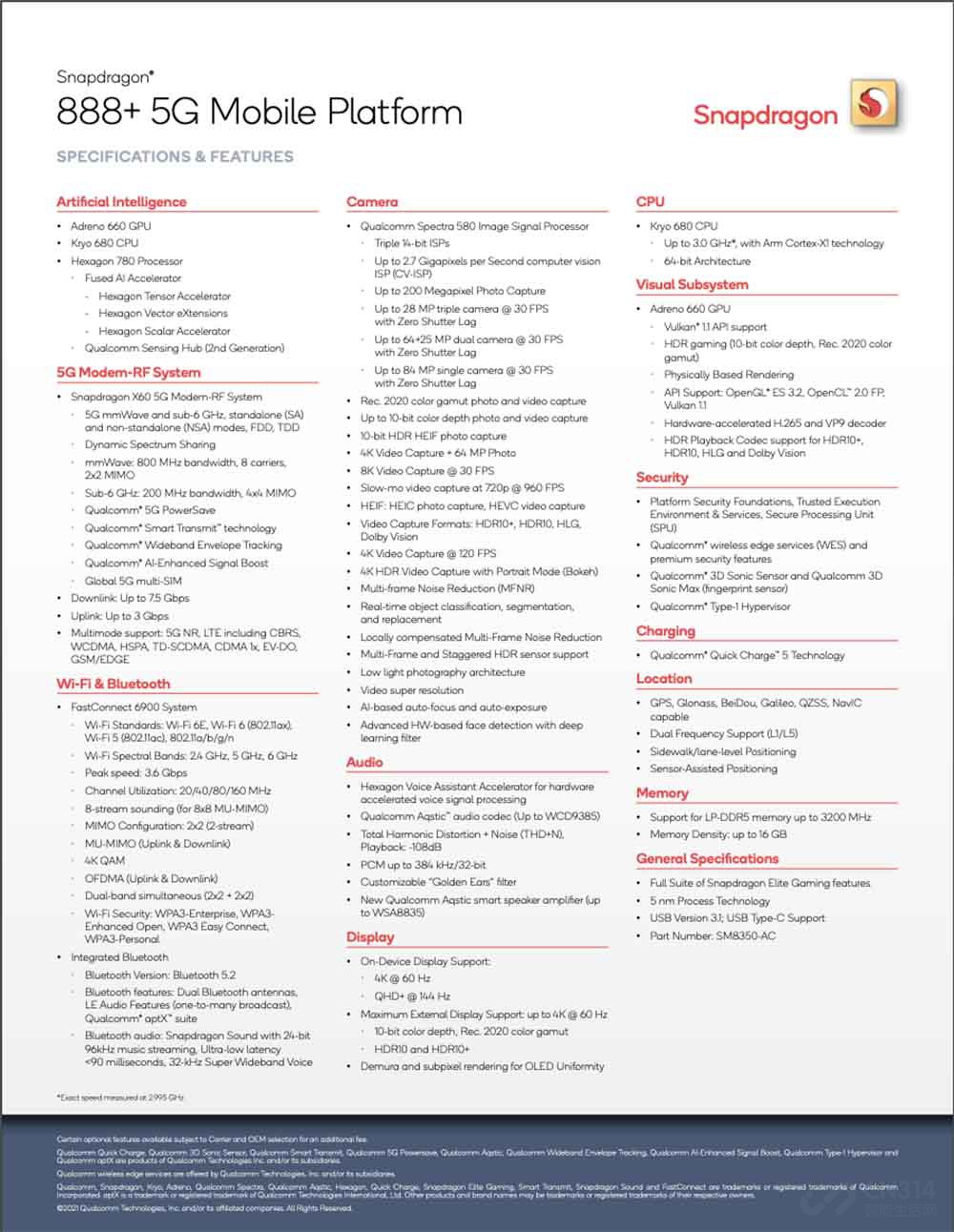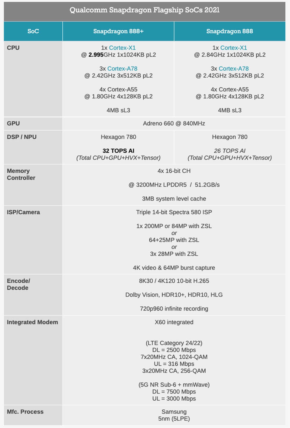 处理器依旧采用三星5nm工艺,主要提升在于将CPU的 Cortex-X1大核主频由 2.84GHz 提升到了2.995GHz(官方≈3.0GHz),性能提升5.2%,还有3颗2.4GHz Cortex A78和4颗1.8GHz Cortex A55能效核心,GPU仍然是Adreno 660;AI方面,支持的第6代高通AI引擎的算力高达每秒32万亿次运算,相较骁龙888,AI性能提升超过20%。